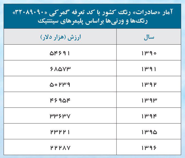 آمار صادرات رنگ کشور با کد تعرفه گمرکی ۳۲۰۸۹۰۹۰ / رنگها و ورنی ها بر اساس پلیمرهای سینتتیک .