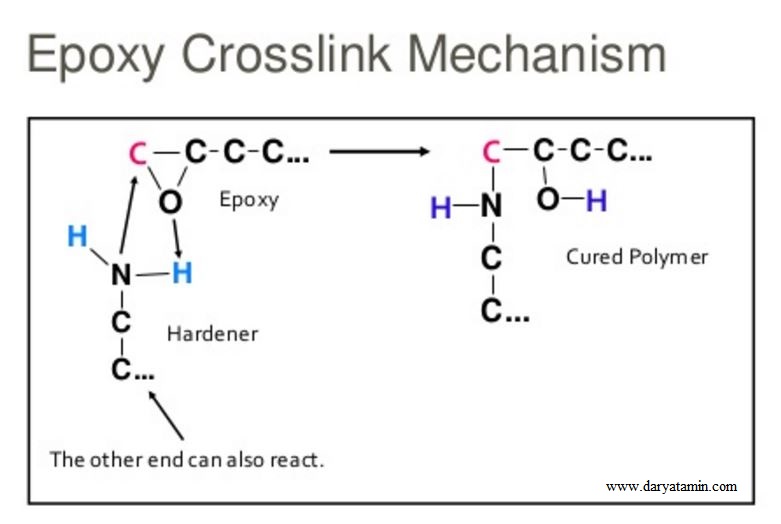در شکل های زیر شبکه تشکیل شده از واکنش رزین اپوکسی (مشکی) و هاردنر آمینی (قرمز) دیده می شود. این فرآیند موجب واکنش دادن و از بین رفتن واحد های اپوکساید موجود در رزین می شود. همچنین واحد های هیدروکسیل باقی مانده در شبکه موجب چسبندگی شبکه رزینی با سطح می شود. چگونگی برقراری این اتصالات در شکل سمت چپ به صورت دقیق شرح داده شده است.