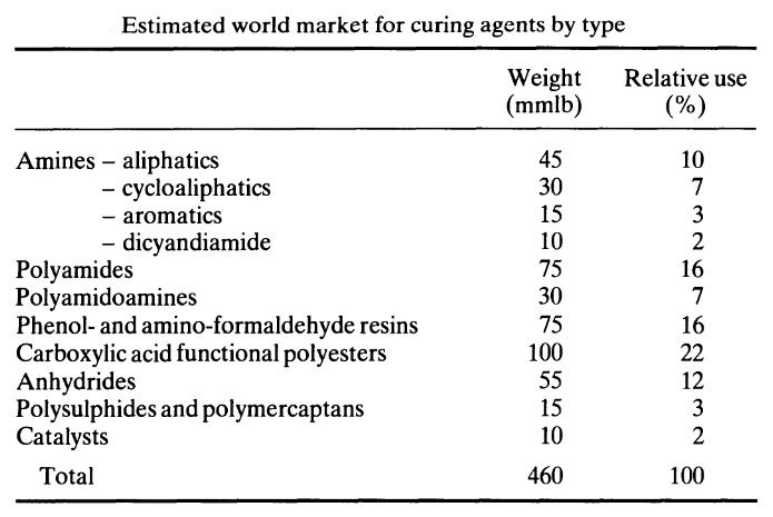 هاردنرها یا عوامل پخت که بخش دوم ساختار رزین اپوکسی را تشکیل می دهند، نقش مهمی در تشکیل فیلم سخت پوشش دارند. این مواد طیف گسترده ای از مواد شیمیایی را شامل می شوند که بخش از این مواد را در ادامه معرفی می کنیم. در جدول زیر به طور کلی انواع هاردنرهای اپوکسی و تخمینی از میزان مصرف سرانه هر یک عنوان شده است. همان طور که در جدول نیز قابل مشاهده است، بخش عمده هاردنرهای مصرفی آمینی یا آمیدی هستند.
